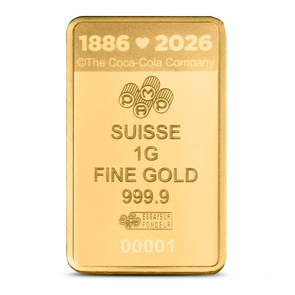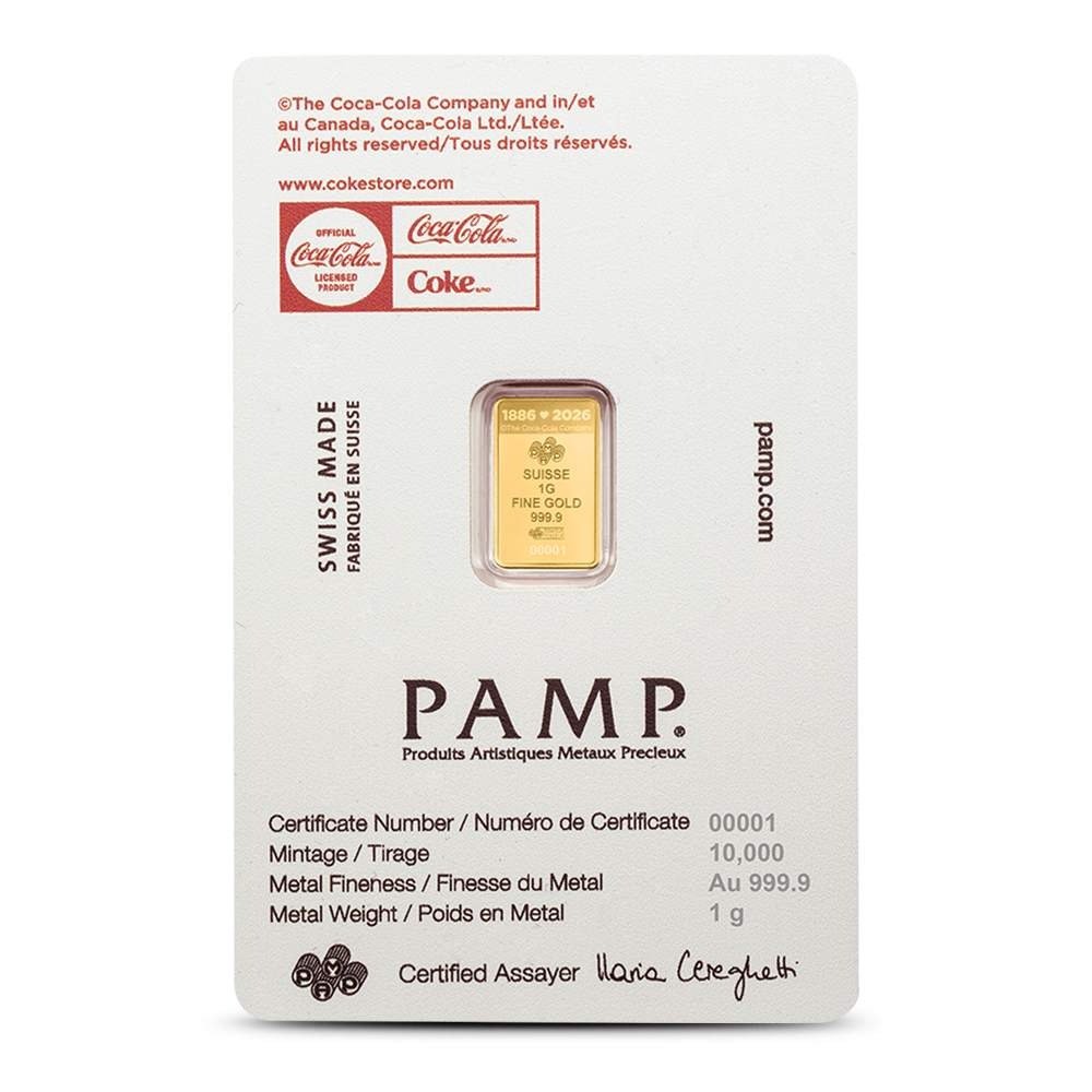 On the reverse of 1 Gram Gold Coca-Cola Valentine’s Love Bars, you’ll find the PAMP Suisse logo and the identifying hallmarks. This side of the bar includes a unique serial number for each piece, as well as the dates 1886 and 2026, referencing the company’s 140th anniversary in 2026.