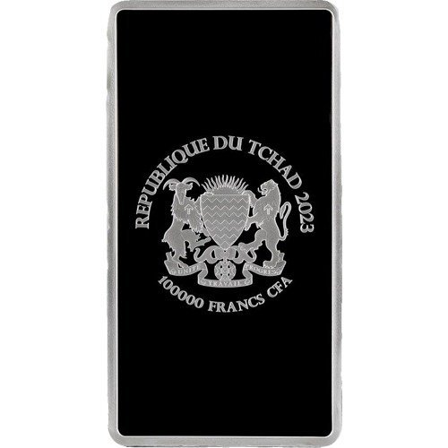 On the obverse field of 2023 1 Kilo Republic of Chad Goddess Europa Silver Coins, you will find the Chadian coat of arms. This design includes a spade-shaped shield with wave lines, a rising sun, a heraldic goat, and a heraldic lion. These beautiful silver coins have a rectangular format.