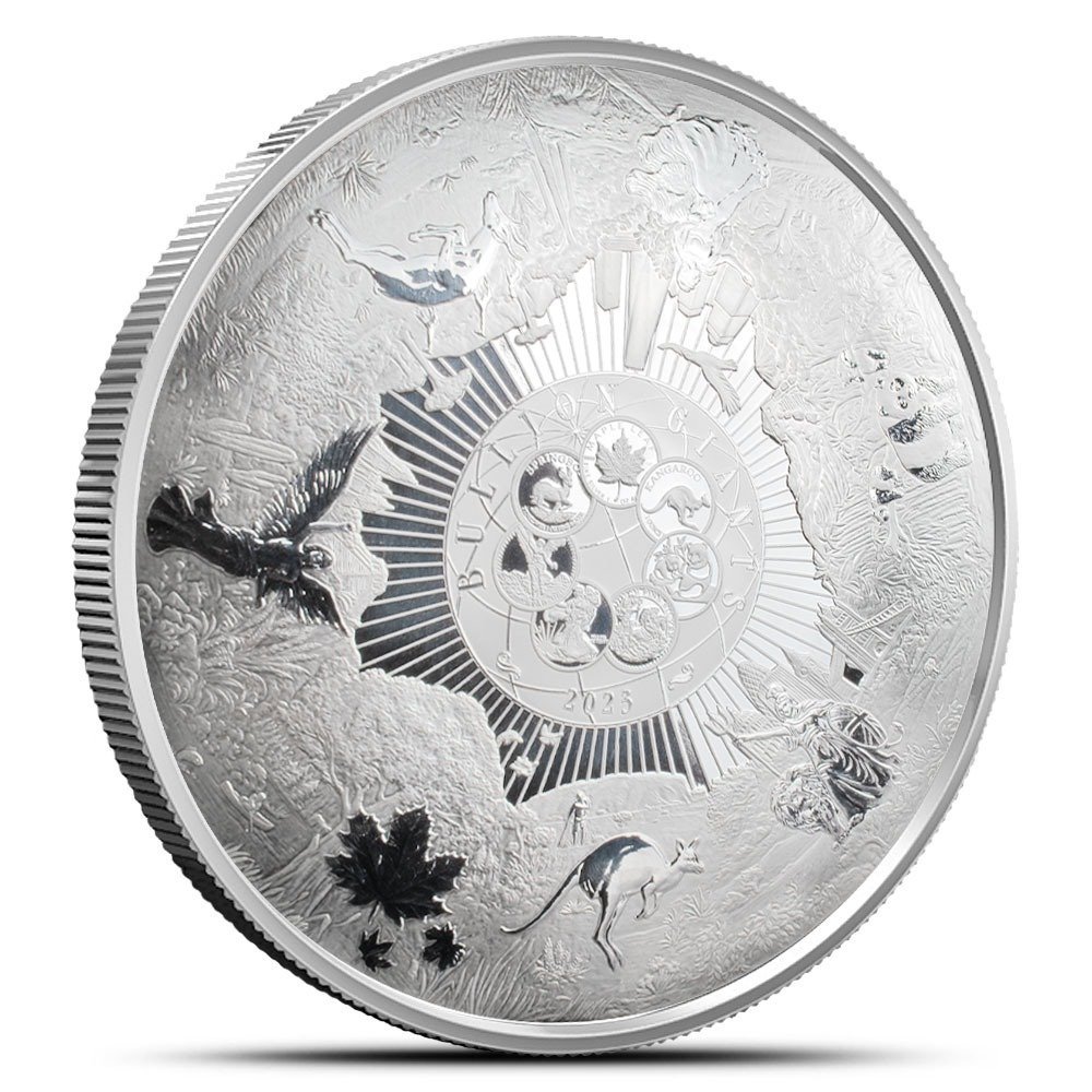 This coin features images of seven popular bullion coins, the American Silver Eagle, Canadian Maple Leaf, South African Krugerrand, Mexican Libertad, Australian Kangaroo, Chinese Panda, and the British Britannia. 2023 1 Kilo Samoa Silver Bullion Giants Coins honor the impact that these coins have made on the bullion world.