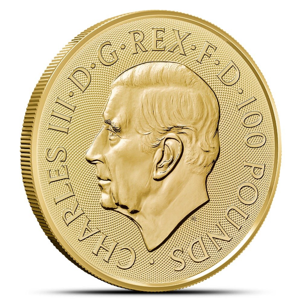 On the obverse of the 2025 British Gold Tudor Beasts The Greyhound of Richmond Coin, you’ll find the first-generation effigy of King Charles III. This left-profile portrait, designed by Martin Jennings in late 2022, shows the King without a crown, in keeping with the modern style adopted by the Royal Mint.