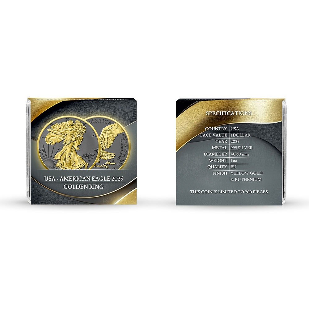 In the 2025 edition of the Silver Eagle Golden Ring, Germania Mint has enhanced the piece with a layer of black ruthenium plating across the background field on both the obverse and reverse. The selective application of 24-karat gold is found in three places. Most notably, the entire edge of the coin is finished with 24-karat gold, hence the name Golden Ring. Additionally, the images of Walking Liberty on the obverse and the American bald eagle on the reverse are finished with gold, creating visual contrast against the black ruthenium backgrounds.