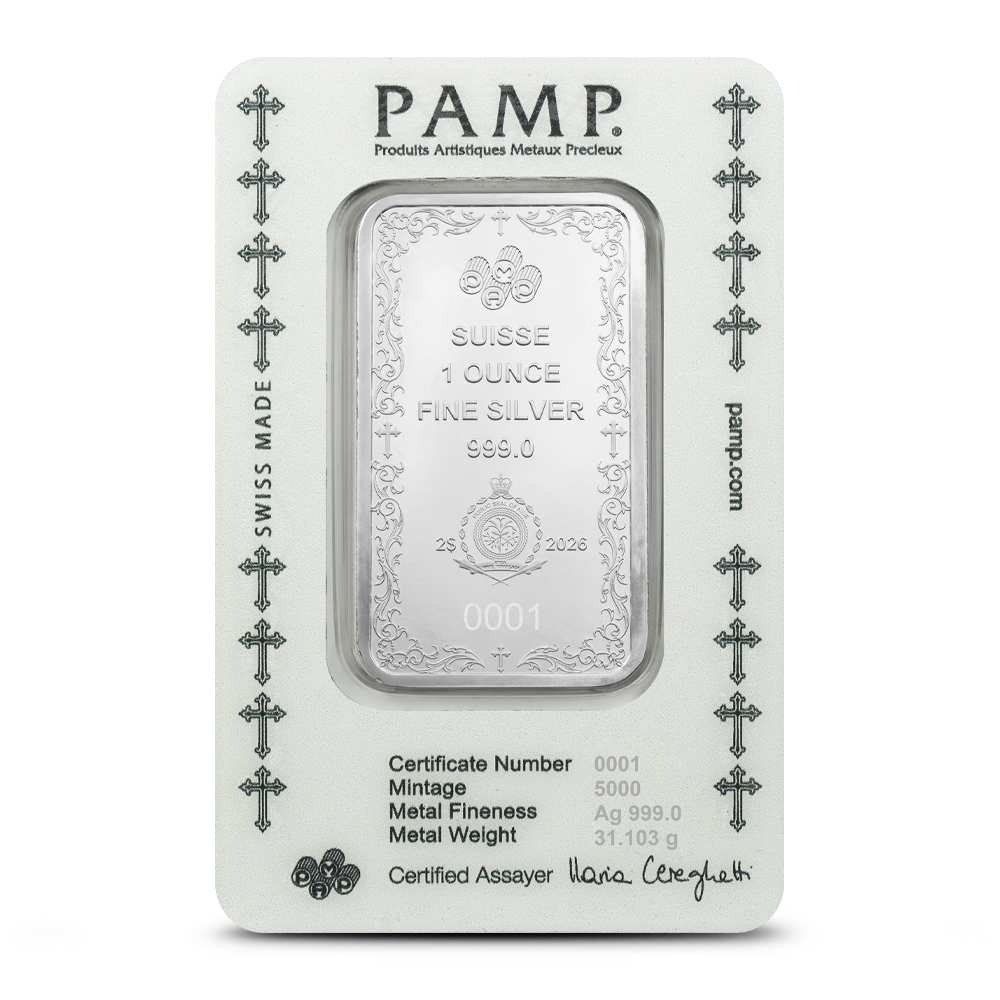 All 2026 1 oz Niue Silver Christian Cross PAMP Suisse Silver Coins come sealed in CertiPAMP cards. The bar-shaped silver coin boasts proof-like visuals and comes with a beautiful design motif on the included assay card. Each coin has an individual serial number on the obverse.