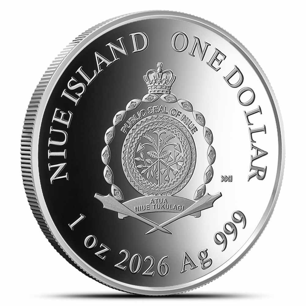 On the reverse of 2026 1 oz Proof Silver 100th Anniversary of Her Majesty’s Birth Coins, you will find a depiction of the Public Seal of Niue. The official coat of arms features native flora at the center of a ring of seashells. Atop the seashells, you will find a Sovereign crown symbolizing Niue’s connection to the Commonwealth.