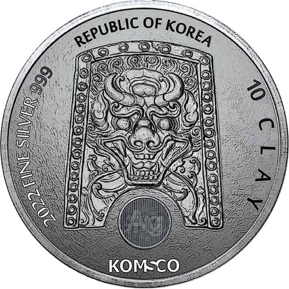 On the obverse of 2022 10 oz South Korean Silver Chiwoo Cheonwang Medals, you will find the Doggaebi shield. This shield was used by Chiwoo in his battles and is easy to identify thanks to the Doggaebi design on the front. According to Korean folklore, the Doggaebi was a shape-shifting trickster who could ward off evil spirits.