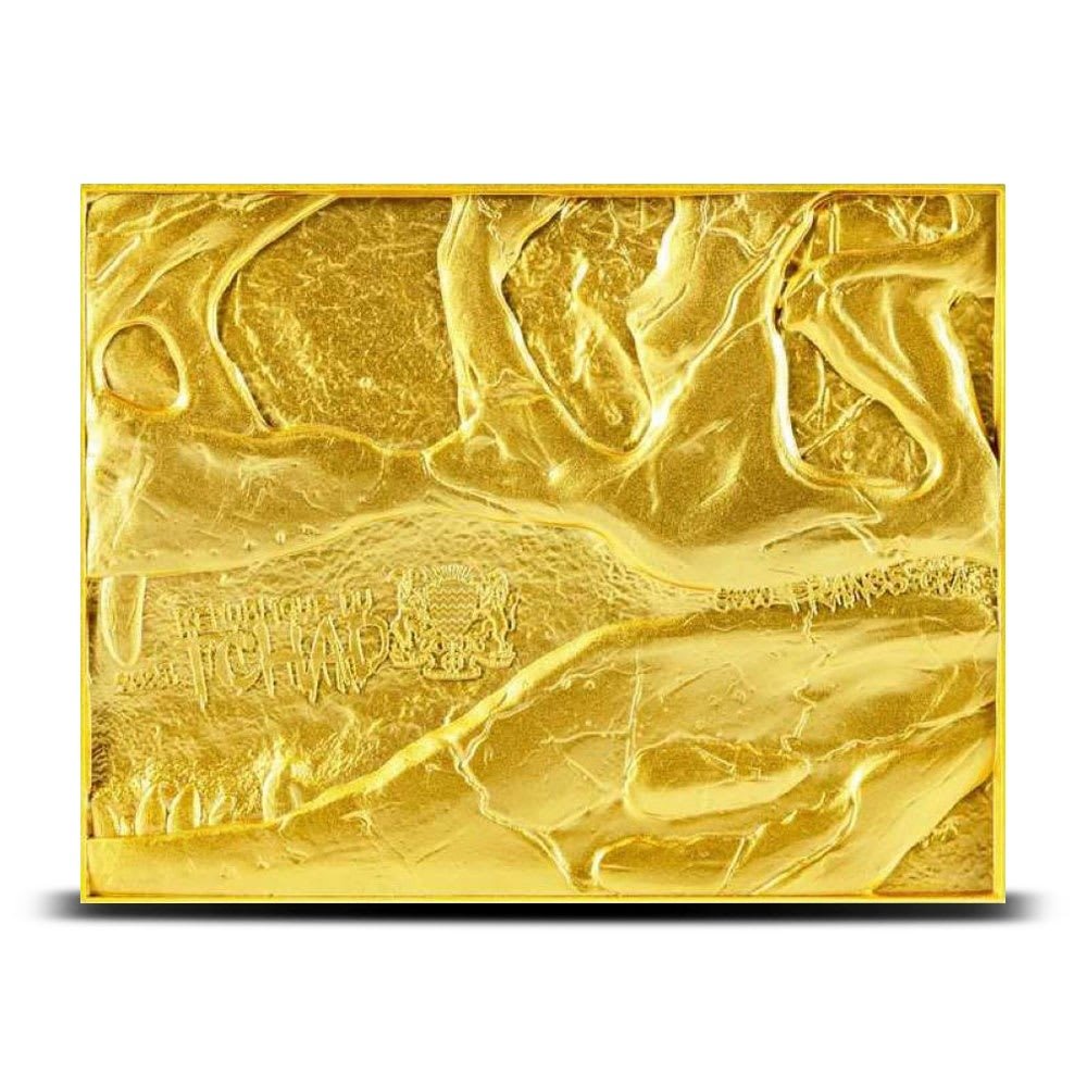 For the reverse of the Republic of Chad Bi-Metal Fossil Coins, the remains of a T-Rex are shown. This high-relief imagery shows the dinosaur’s face only as it looks to the right. The entire backdrop of this design has been gilded for a beautiful contrasting effect.