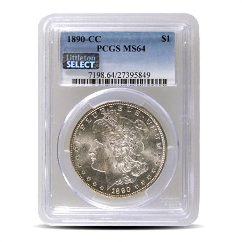 All of these 1890-CC Morgan Silver Dollar Coins are available to you for purchase in plastic slabs with a Mint State 64 grade. Coins in this condition have average mint luster. You will find several small contact marks and one or two heavier marks. There are also one or two small patches of hairlines on the coins, as well as noticeable, light scuff marks.
