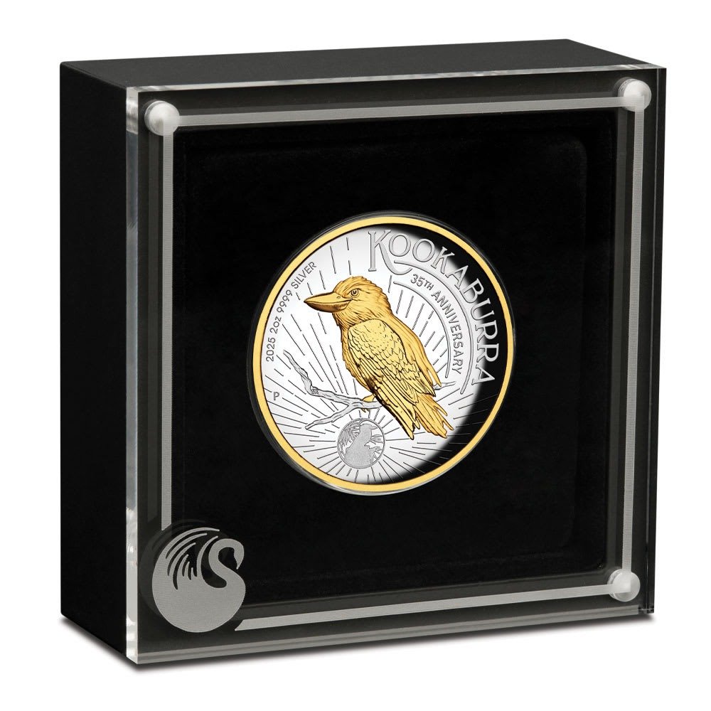 Perth Mint is celebrating the 35th anniversary of its beloved Kookaburra Series in 2025. The mint is not only celebrating with the release of various proof coins, but also with the inclusion of the original 1990 design within its 35th-anniversary design. In a series famous for its ever–changing depictions of the kookaburra, the inclusion of the original design offers a strong connection across the decades. Right now, 2025 2 oz Proof Australia Silver Kookaburra Coins with gilded elements are available.