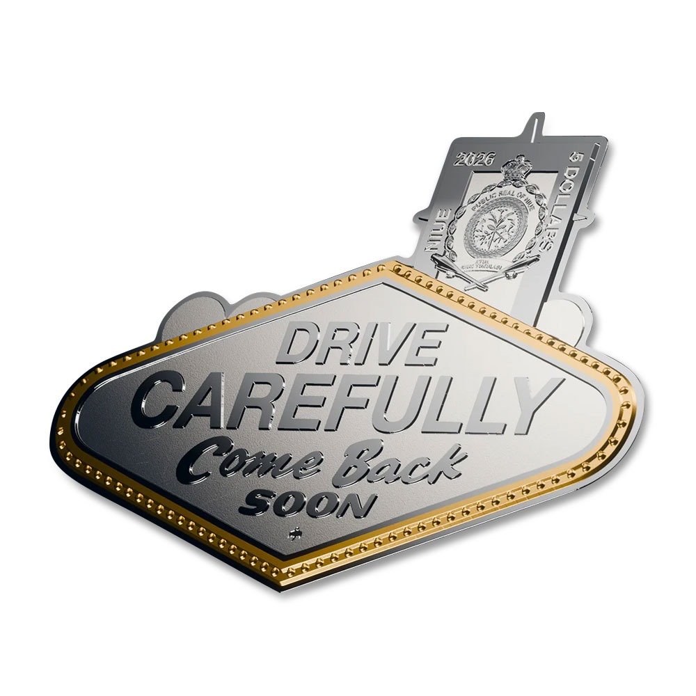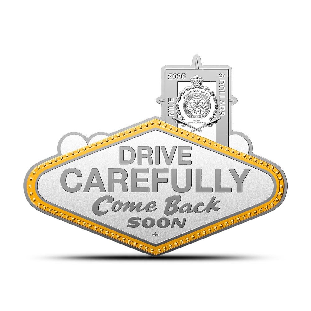 The obverse of 2026 Proof Colorized Niue Silver Welcome to the Fabulous Las Vegas Shaped Coin comes with the Public Seal of Niue at the top of the sign. This side of the coin features a message that reads “Drive Carefully Come Back Soon” in a similar style. This farewell message reinforces the hospitality theme while adding a practical safety reminder for departing visitors.