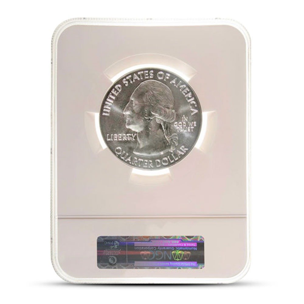 The coin’s obverse side bears a profile portrait of America’s first President, familiar from the nation’s circulation quarter over the course of the last eighty years and designed in 1932 by John Flanagan, a celebration of the bicentennial birthday of George Washington. It also carries the inscriptions “United States of America,” “Liberty,” “In God We Trust,” and “Quarter Dollar.”