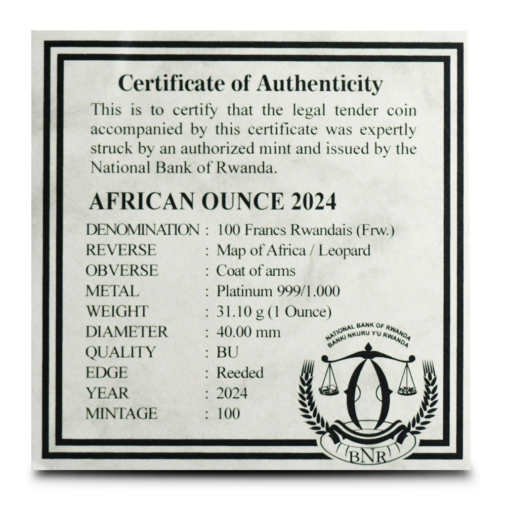 Each 2024 1 oz Rwandan Leopard Platinum Coin will arrive inside a display box. Each coin also comes with a Certificate of Authenticity. These platinum coins will have a mintage of 100 and are made with .999 pure platinum.