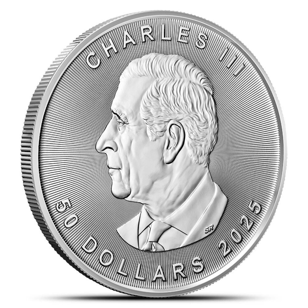 Obverse design elements on 2025 Canadian Platinum Maple Leafs include the new bust of His Majesty King Charles III. Introduced on Canadian Maple Leafs in 2024, this left-profile relief of Charles III depicts the monarch without a crown on his head. His Majesty’s effigy was created by Steve Rosati.