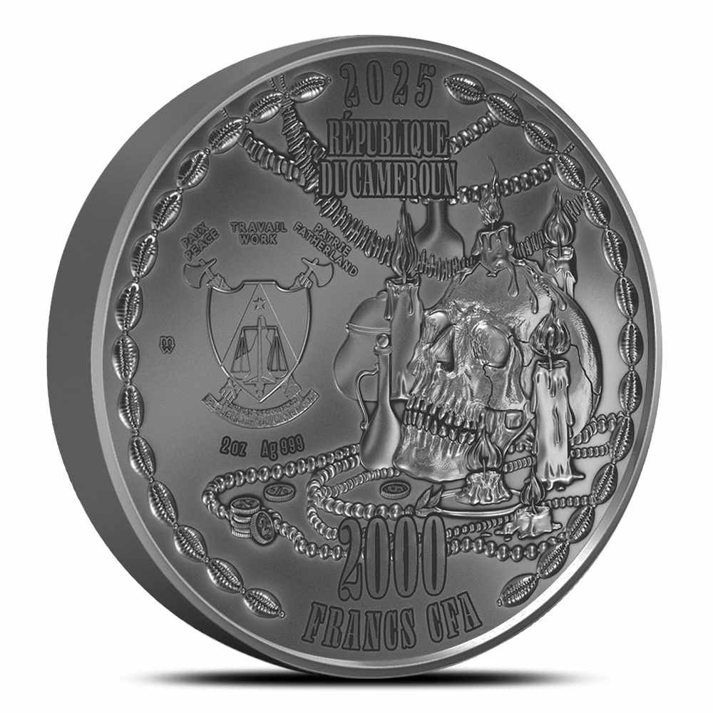 On the obverse of 2025 Antique Colorized Cameroon Silver Baron Samedi Coins, you will find an image of the Cameroonian coat of arms. The national seal is found to the left of the primary design, which features a skull with candles all around it. The Baron’s prominence grew throughout Haiti’s history as communities sought spiritual intermediaries to navigate death’s profound presence during periods of hardship, revolution, and resilience, making him an enduring symbol of how Haitian Vodou transformed trauma and cultural displacement into a rich spiritual tradition that acknowledges death’s power while refusing to fear it.
