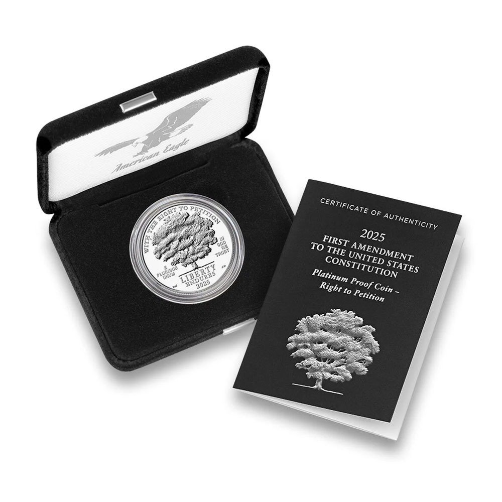 The Proof American Platinum Eagle is the only bullion series at the US Mint to feature new designs each year. While the BU Platinum Eagle has remained consistent for decades, the Proof Platinum Eagle offers the US Mint a vehicle to showcase a variety of designs celebrating American history. The latest sub-series within the collection is the First Amendment to the United States Constitution Series (2021-2025). Right now, the 2025-W 1 oz Proof American Platinum Eagle Coin is available.