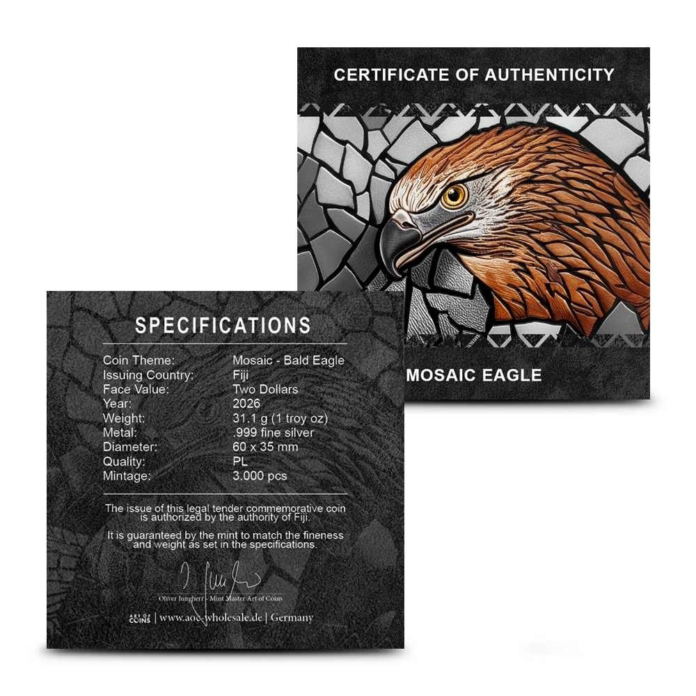 Each 2026 1 oz Fiji Silver Mosaique Bald Eagle Coin comes with a protective capsule and a Certificate of Authenticity. The coins feature a high-relief strike that delivers greater 3D impact for the design elements, as well as a unique mosaic design concept that mimics the appearance of several smaller pieces coming together to form a cohesive visual element. This coin is the first design in the new Mosaique Ingots Series.