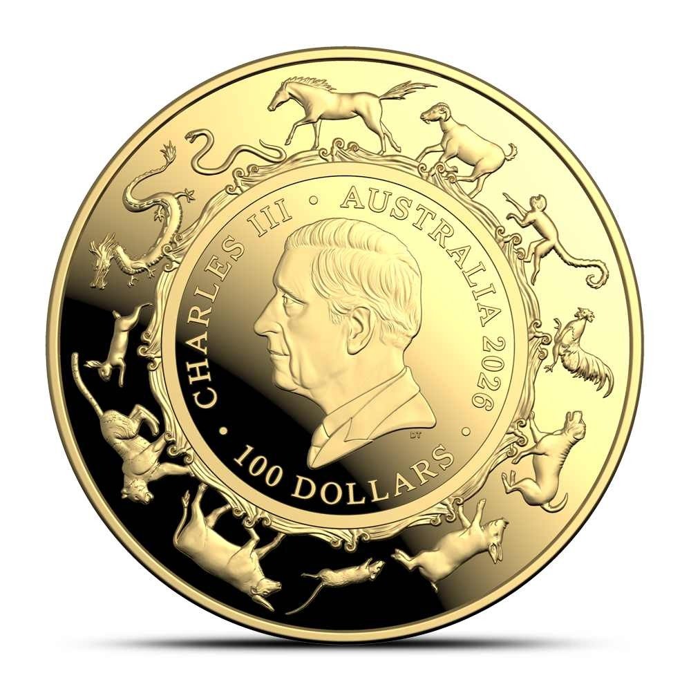 The obverse of the 2026 Proof Royal Australian Mint Gold Year of the Horse Domed Coin comes with a portrait of King Charles III. His Majesty is shown here in left-profile relief and is encircled by a ring with all 12 of the animals from the Zodiac. In honor of the Year of the Horse, the horse is featured at the top of the ring.