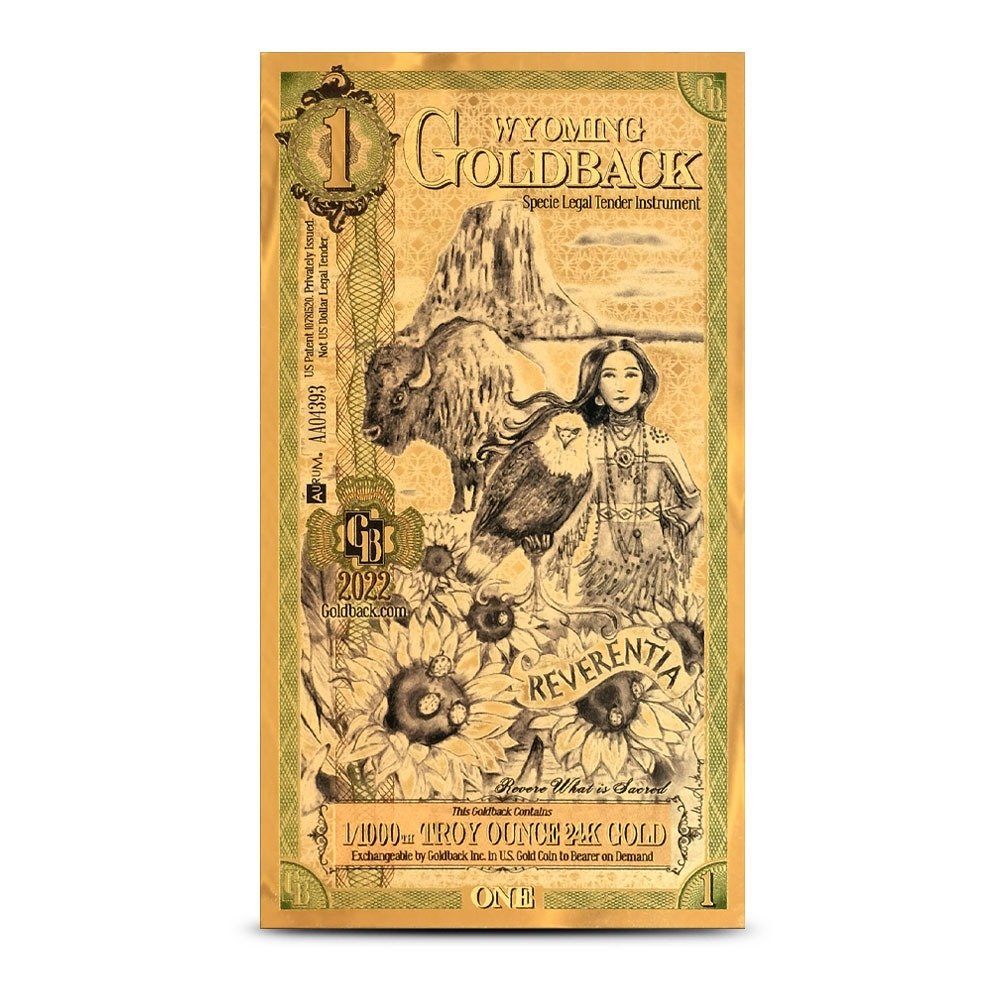 The 5 Piece Wyoming Goldback Note Set contains 5 gold notes, each with a unique obverse field. While each design field is different there are some similarities throughout. Each obverse design features the image of a woman, along with at least one animal, and a Latin word. For example, the 1 Wyoming Goldback features a woman wearing indigenous clothes alongside a bald eagle and an American bison. Displayed near her is the word “Reverentia” meaning respect and reverence.