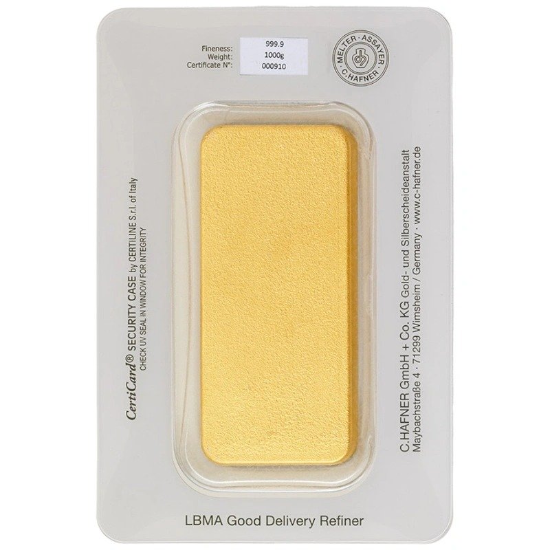 A 1kg minted gold bar from the LBMA-approved manufacturer C. Hafner, presented in its own case with a unique serial number on both the bar and packaging.