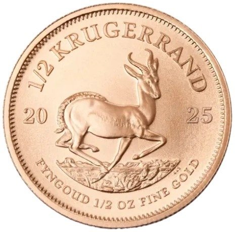 The 2025 1/2oz Krugerrand is a South African gold coin, minted by the Rand Refinery. The weight of the coin is 16.96 grams with a fineness of 916.7 (22 carat gold), this means it contains 15.55 grams of pure gold. The diameter of the coin is 27.07 mm. The 1/2oz Krugerrands are considered legal tender in South Africa, but do not have a face value.