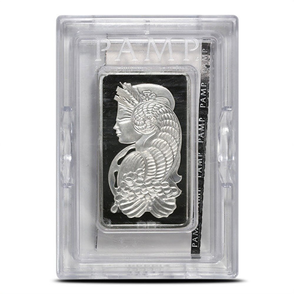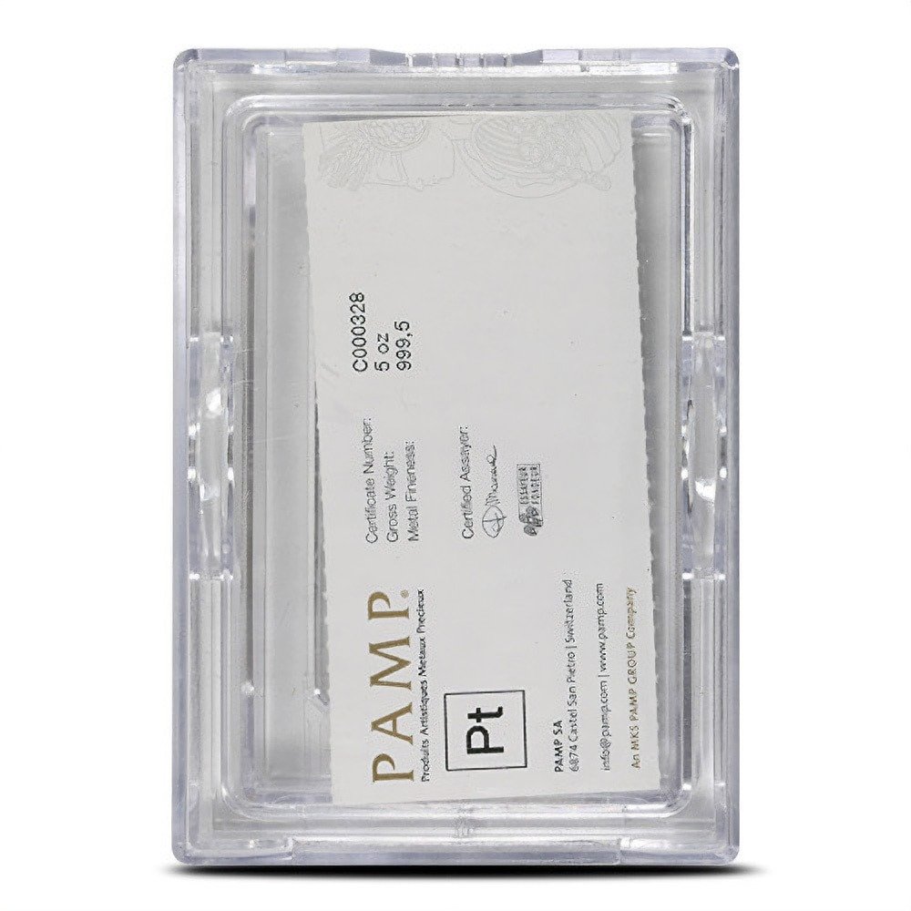 While we cannot guarantee the particular bar you will receive, it is possible to offer insight on the design elements you will find on the bars. One of the most common 5 oz Platinum Bars available comes PAMP Suisse and the Fortuna Series. The obverse of these 5 oz Platinum Bars features a left-profile portrait of the Roman goddess of fortune. On the reverse of the bars, you are going to find the image of the PAMP Suisse logo with identifying details for the bar, such as the weight, purity, and metal content.