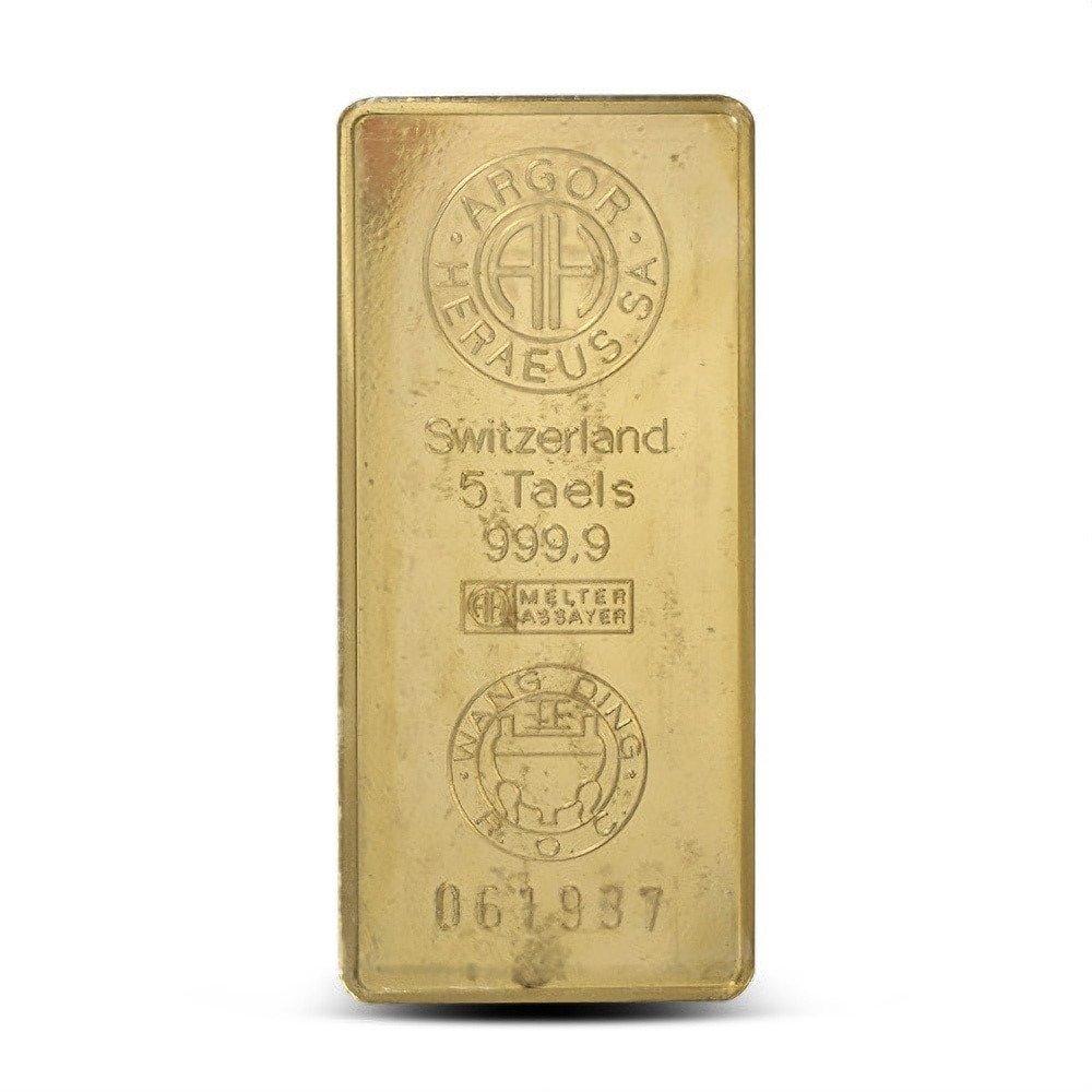 Obverse and reverse designs on the 5 Taels Gold Bars in this listing vary based on the specific product you receive. As an example of a 5 Taels Gold Bar you might receive, consider the 5 Taels Gold Bar of Argor-Heraeus. These bars have the Argor-Heraeus logo at the top with inscriptions of the nation of issue, weight, purity, and an assayer’s mark. Each of the bars comes with an individual serial number.